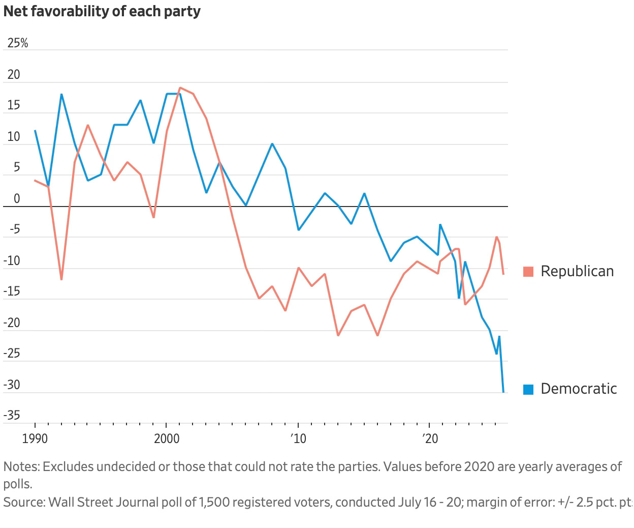De hecho, los demócratas se encuentran en su punto más bajo en 35 años en términos de favorabilidad del partido. Una encuesta reciente del Wall Street Journal expone los detalles sangrientos: