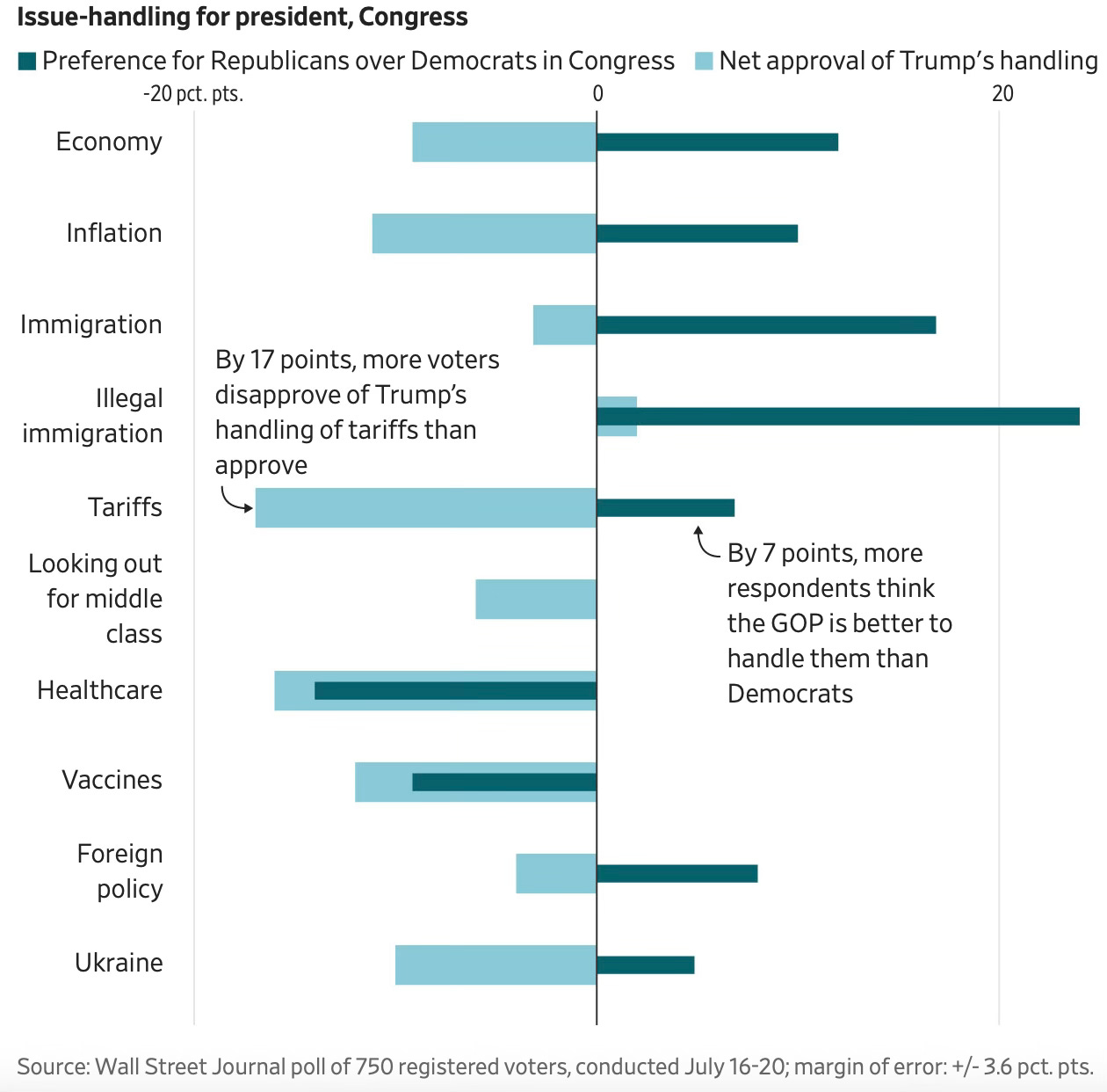 Lo mejor para los demócratas en esta última encuesta del WSJ es que, a pesar de su pésima imagen, aún mantienen una ligera ventaja de 3 puntos en la boleta genérica del Congreso (aunque esto es más de la mitad del tamaño de su ventaja en un punto similar en 2017 por delante de los republicanos que perdieron 40 escaños y la mayoría de la Cámara en las elecciones intermedias). con un gran porcentaje de estadounidenses que creen que el Congreso no está haciendo lo suficiente para mantener a Trump a raya. El 57 por ciento de los votantes dice que el Congreso está haciendo muy poco "para actuar como un control y equilibrio de los poderes de Trump". Por lo tanto, un mensaje básico de 2026 que aboga por un gobierno dividido para detener la extralimitación republicana puede ser suficiente para que los demócratas recuperen la Cámara.