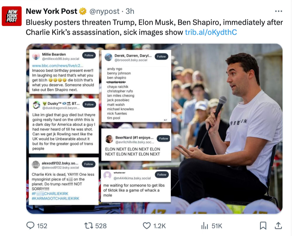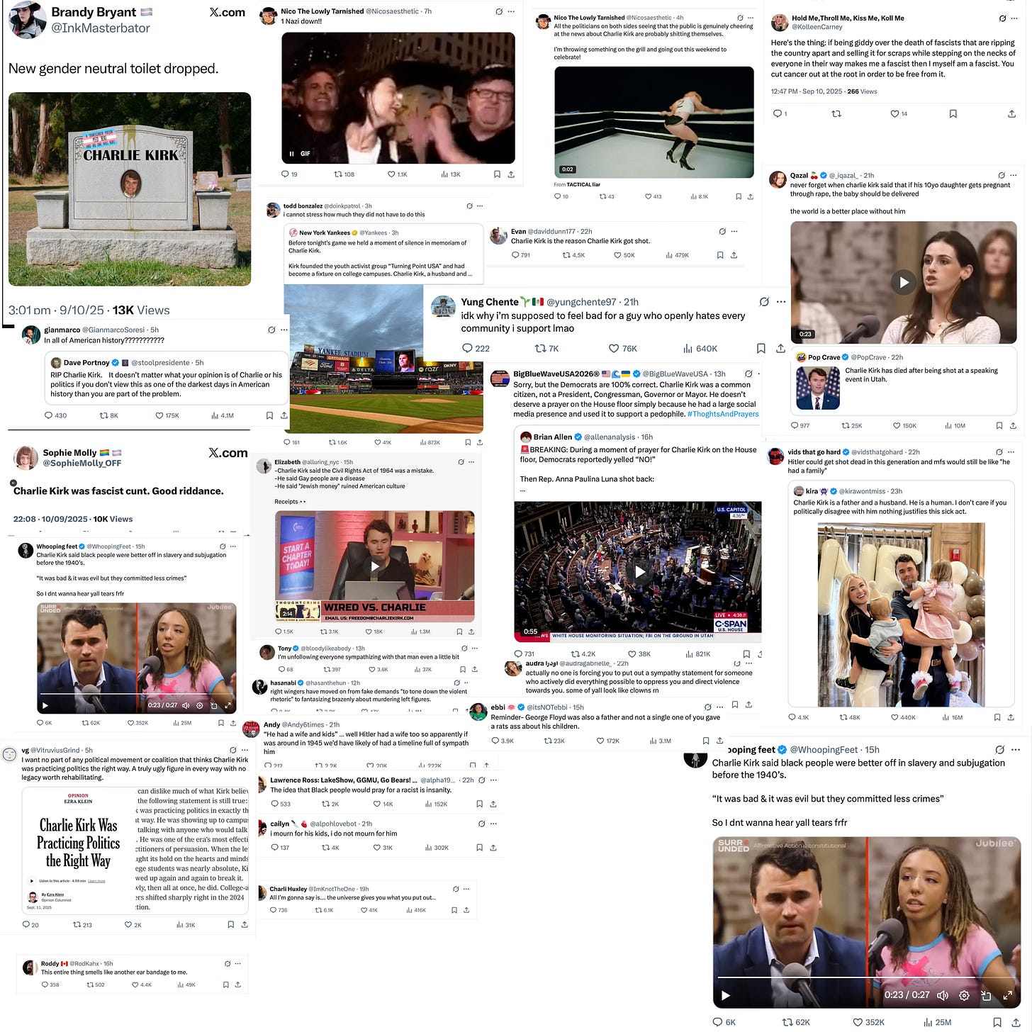Todo lo que tenían que hacer era lo mínimo, permanecer en silencio u ofrecer condolencias y algún comentario genérico sobre la libertad de expresión y cómo la violencia política nunca está bien. Pero ni siquiera pudieron hacer eso. ¿Por qué? Porque no queda nada de ellos. Todo lo que tienen es esta necesidad patológica de controlar a todos y todo, ya sea destruyendo las carreras de los criminales de pensamiento convictos o celebrando sus asesinatos. Todo lo que saben es que querían que se fueran.