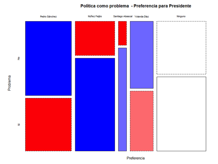 Los rectángulos azules en la imagen que sigue indican que para los partidarios de Alberto Núñez Feijóo y Santiago Abascal la política es un problema importante. Ocurre lo contrario entre los partidarios de Pedro Sánchez y Yolanda Díaz. El efecto es más acusado entre los partidarios de Núñez Feijóo y Pedro Sánchez (el azul es más intenso). No hay diferencias entre los que no quieren de presidente a ninguno de los líderes mencionados.