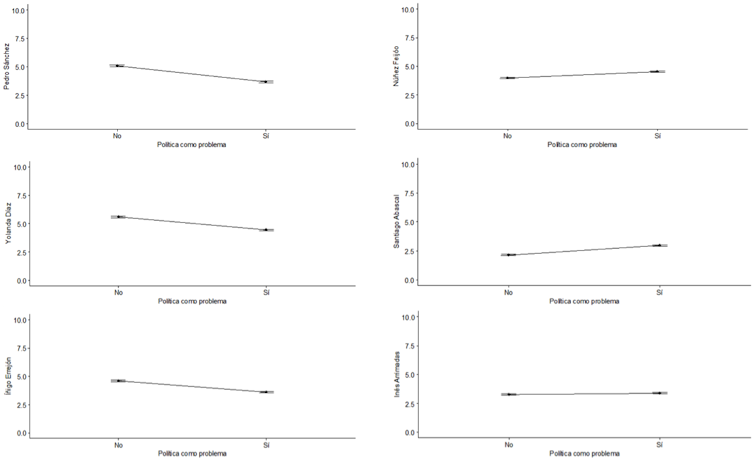 Como muestra la siguiente imagen, quienes creen que la política es un problema valoran peor a los líderes de izquierdas y mejor a los líderes de derechas y viceversa. Las diferencias son más acusadas cuando se valora a los líderes de izquierdas.