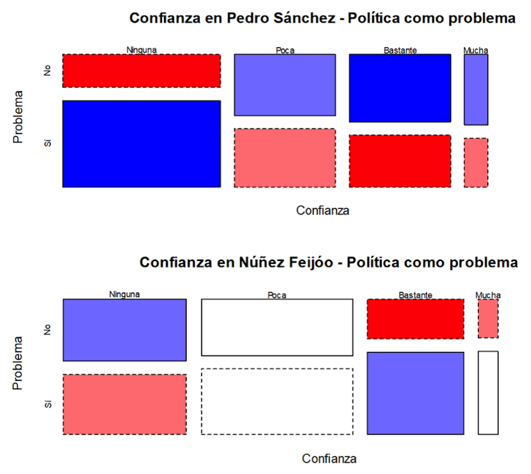 Los rectángulos azules de la siguiente imagen muestran la falta de confianza en Pedro Sánchez de quienes piensan que la política es un problema. En cambio, tienen bastante confianza en Núñez Feijóo. Los que no creen que la política es un problema tienen poca, bastante o mucha confianza en Pedro Sánchez. Y no tienen confianza en Núñez Feijóo.
